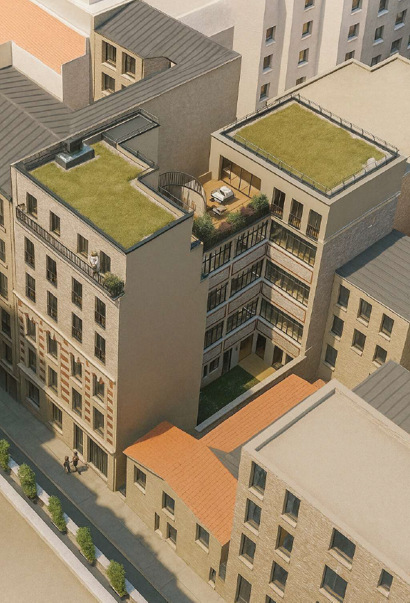 Le projet combine une surélévation en bois et métal, habillée de brique et d'enduit, qui valorise les inspirations haussmannienne et industrielle.